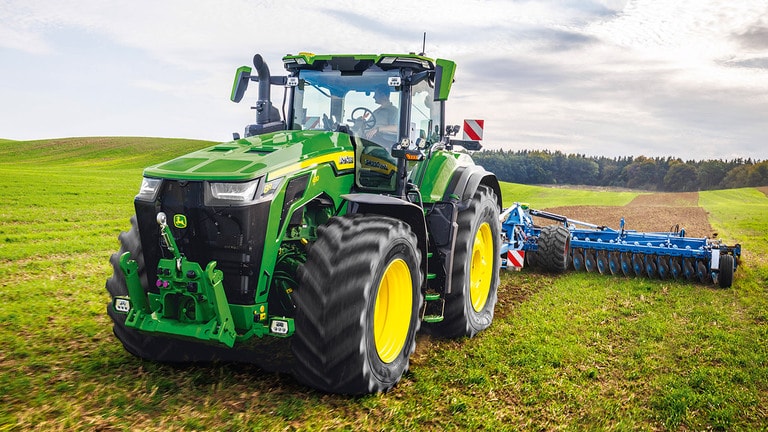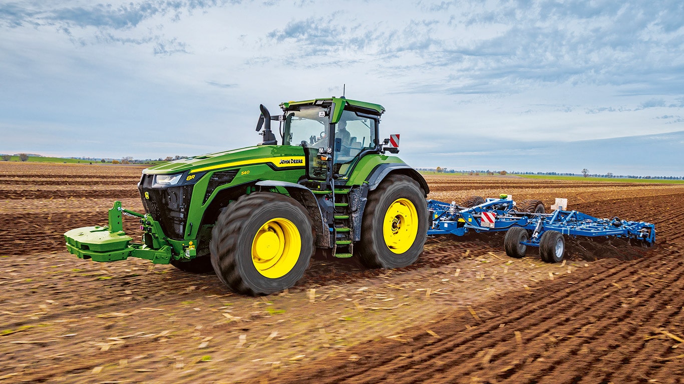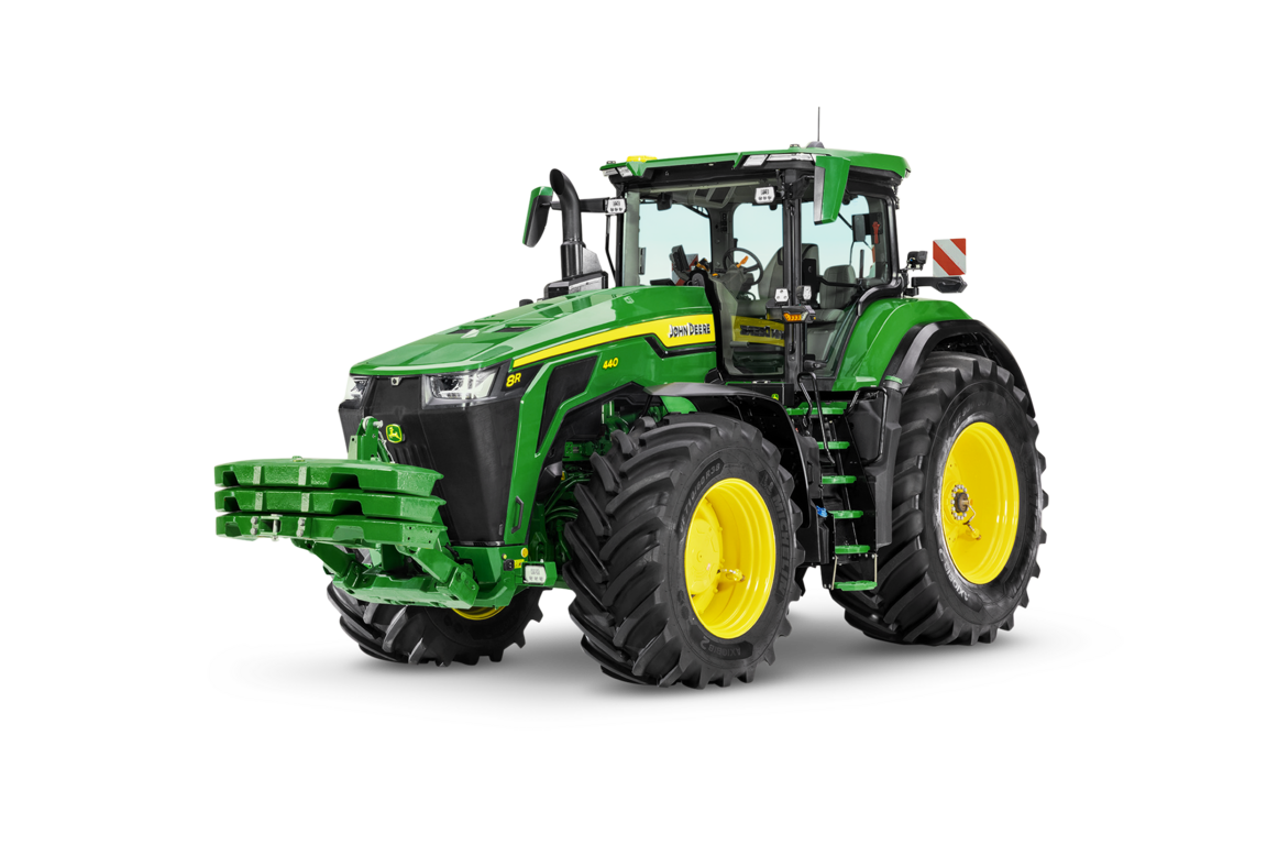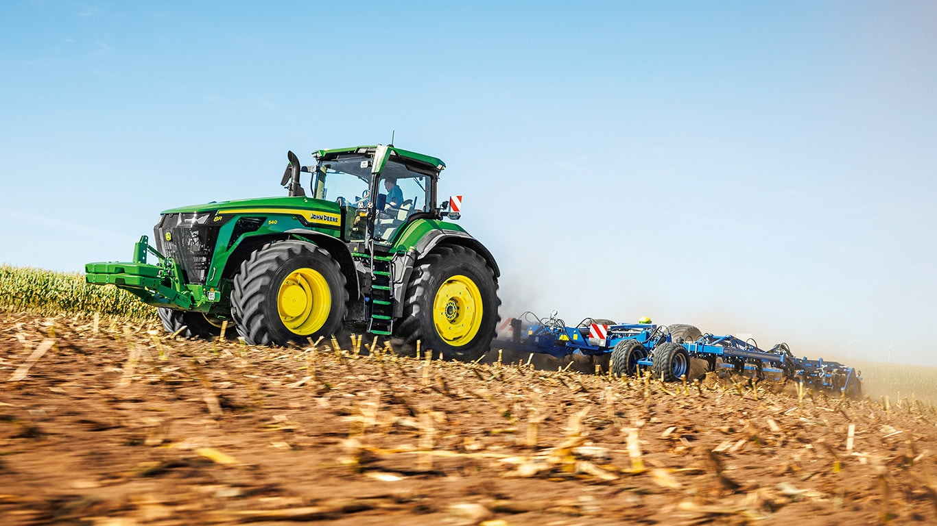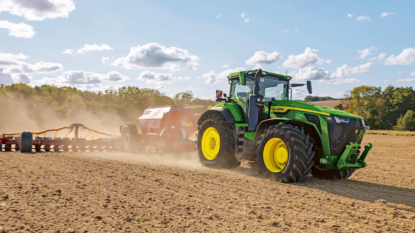 Novi visokozmogljivi traktorji 8R zagotavljajo vlečno moč, ki jo potrebujete za najzahtevnejše priključke. Motor JD14 s funkcijo Peak Power IPM zagotavlja do 473 kW (634 hp) natanko takrat, ko je potrebna največja produktivnost v vseh pogojih. Edinstveni menjalnik eAutoPowr™ omogoča brezstopenjsko pospeševanje in do 8 % boljši prenos moči v primerjavi s standardnimi hidromehanskimi brezstopenjskimi menjalniki*. Nov visokozmogljiv traktor 8R z 2,30-metrskimi zadnjimi in 1,85-metrskimi sprednjimi kolesi ter enovrstnim sistemom CTIS zagotavljajo boljšo zaščito tal, prenos moči in vsestranskost.